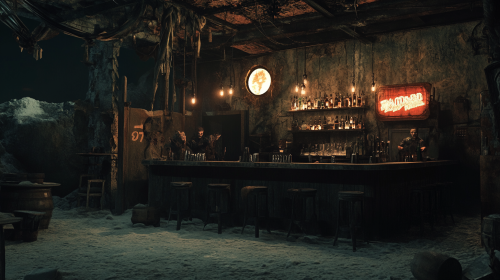 a bar like mad max in the desert. the men lookin a glamour danceuse. post-apocaliptic design. ultra realistic. Photorealitic. Dark. dramatic lighting. --ar 16:9