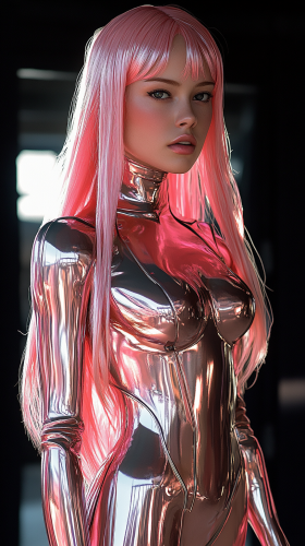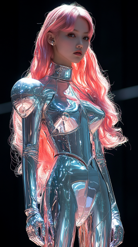 80s anime, beautiful villain woman with long light pink waves hair in the style of Yoji Shinkawa and final fantasy artstyle, pink iridiscent, cinematic lighting, sharp shiny chrome metallic plunge suit, black background, chromed silver reflections, chrome reflections on body parts, by Masamune Shirow, Hajime Sorayama, Hiroshi Nagai, Ilya Kuvshinov, tetsuo harano, Ross Tran, by Greg Rutkowski --ar 9:16 --s 750 --v 6.1
