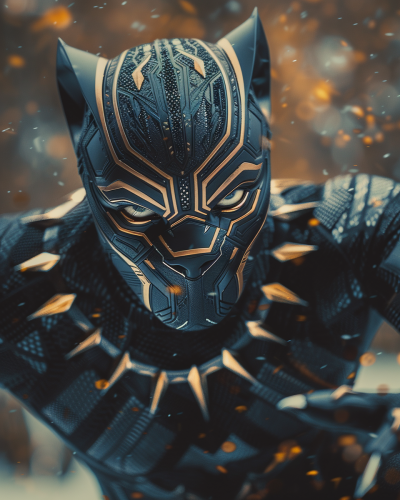 blurred out of focus photo of a stunning interpretation of the most artistically and aesthetically refined representation of the deepest and darkest essence of Chadwick Bosman as Black Panther in his Black Panther outfit, dynamic action pose, soft vignette, f/1.4 1/10 sec shutter, soft light --ar 4:5 --stylize 250 --v 6.0
