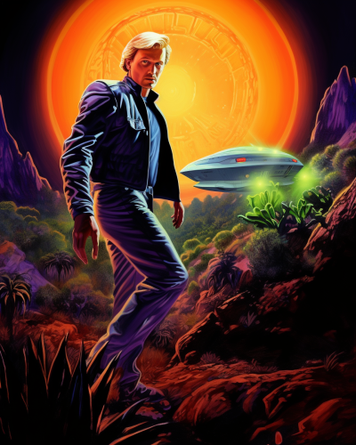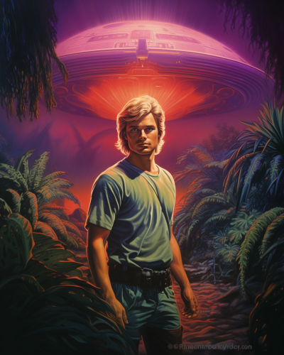 Full body view of a Blonde aryan man holding a weapon looking at a UFO spaceship. 1980s vibe. Style of Boris Vallejo. Night time. Bright colours. Magical plants. oil painting, cinematic, high resolution, ultra detailed. --v 5.2 --ar 4:5