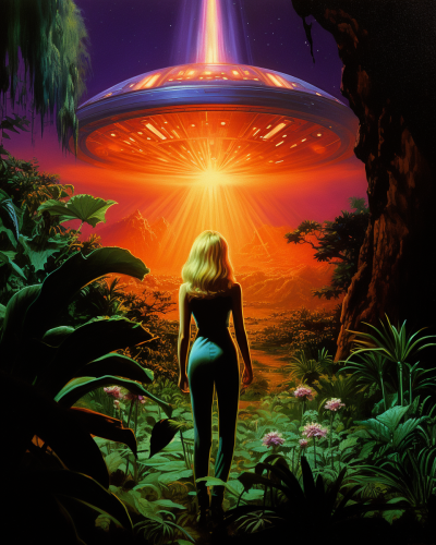 Full body view of a Blonde aryan Vril woman looking at a UFO spaceship. 1980s vibe. Style of Boris Vallejo. Night time. Bright colours. Magical plants. oil painting, cinematic, high resolution, ultra detailed. --v 5.2 --ar 4:5