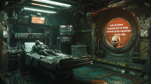 In the infirmary of the burned-out abandoned ship, a dead crew member was lying on a hospital bed, "full of tubes inserted into his body connected to the machines on the side." There was a huge terrifying head in a huge glass sculpture vessel beside him. Wearing full armor and wearing a Marine with a gun, the scene is gloomy and terrifying, with cinematic Rembrandt lighting, movie stills, shot with ARRI cameras, and a horror movie atmosphere --ar 16:9 --q 2 --seed 594234596