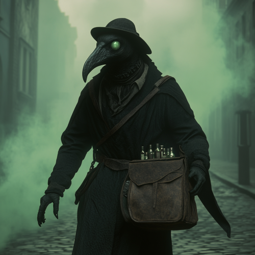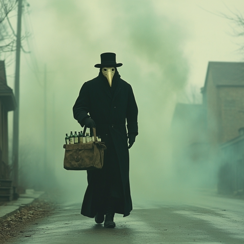 Wearing a black robe, a black tweed cap, a beak mask covering its entire face, and carrying a brown satchel full of medicine bottles, it walks down a town road filled with pale green smoke, with a horrifying atmosphere and a dimly lit background, in the style of a DVD cutscene from a 1950s movie