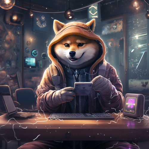 a cute shiba who is using it phone with a very nervous and hilarious face, with th background in a cyberpunk atmosphere