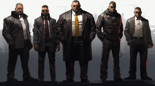 Concept art sketches of several cyberpunk businessmen, fat, large, dystopian, cyberpunk, suits, rich, wealthy, concept art --v 5.2 --ar 16:9
