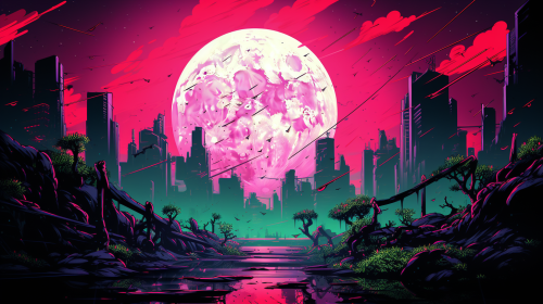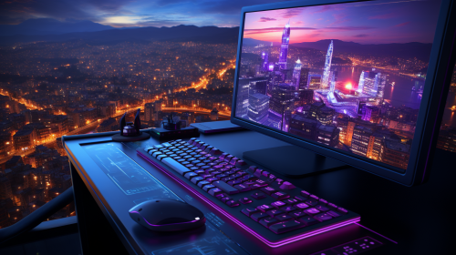 Create an image of a dark wallpaper showcasing a futuristic, cyberpunk-themed Linux operating system interface. The wallpaper should have a high-tech digital aesthetic, with glowing neon colors like blue and pink. Include elements such as a terminal window with code, translucent widgets displaying system information, and a digital clock. The background should have a cityscape silhouette with cyberpunk vibes, including high-rise buildings with holographic advertisements. The overall atmosphere should be sleek and modern with a touch of science fiction, reflecting the advanced nature of Linux in a cyberpunk future. --ar 16:9 --s 750 --v 5.2