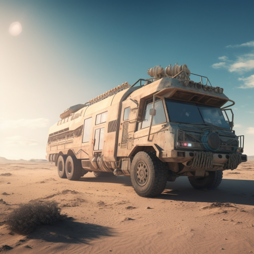 a huge megalithic sci fi bus with gigantic all terrain wheels carrying passengers through a vast desert --v 5.0 --s 250