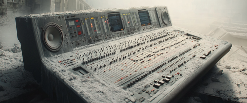a large mixing console heavily covered in tons of white and grey dust and ashes lying in an abandoned flat infinite landscape, post atomic mood --ar 43:18