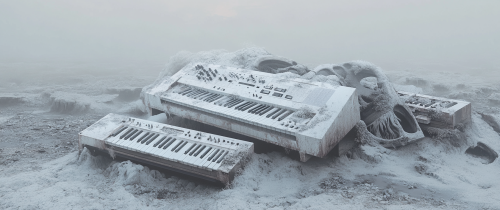 several synthesizers heavily covered in tons of white and grey dust and ashes lying in an abandoned flat infinite landscape, post atomic mood --ar 43:18