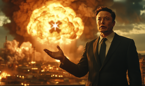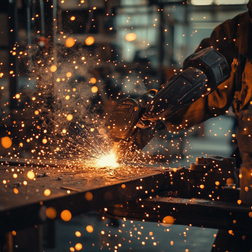 A welding machine in operation, sparks flying in all directions as it welds metal. The scene is intense, with bright, fiery sparks illuminating the dark workshop environment. The welder is partially visible, wearing protective gear, with a focused expression. The metal being welded glows red-hot, adding dramatic lighting and contrast to the scene.