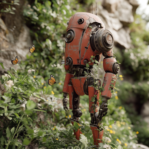 Explorer robot who likes gardens and butterflies land on him, he used to be a mercenary robot, and now he likes the quiet life, in the style of comic book warhammer sci-fi epic fantasy unreal engine