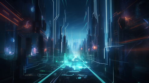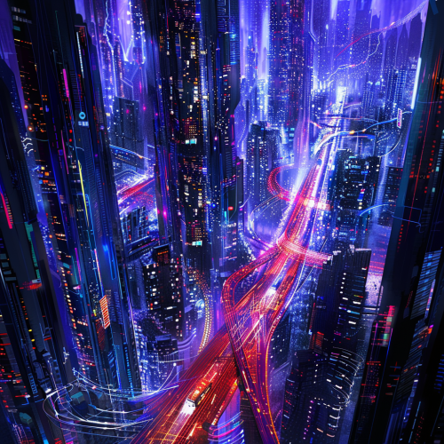 Very Powerful, Meaningful, and Stunning Visual fora A glowing, fiber-optic cable weaving through a futuristic cityscape, illuminating the skyline with vibrant colors, representing innovation, connectivity, and the pulse of modern life. Art Style: Cyberpunk Futurism --v 6.0