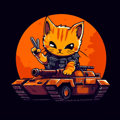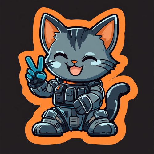 futuristic minimalistic mercenary company patch logo of a cute cyborg kitten with a mischevious expression holding a 50s sci fi ray gun winking and giving the peace sign