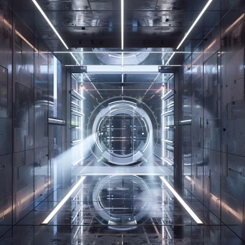Very Powerful, Meaningful, and Stunning Visual for A futuristic, high-tech vault door embedded in a sleek wall of glass and steel, with light beams scanning the surroundings, symbolizing advanced protection, hidden knowledge, and the evolution of storage systems. Art Style: Cybersecurity Futurism --v 6.0