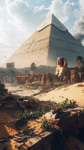 A futuristic Cairo in the year 2100, where the ancient pyramids stand as silent monuments in a world abandoned by humans. The Great Pyramids of Giza are partially buried under sand dunes, with the desert slowly reclaiming the landscape. Vegetation has begun to grow around the base of the pyramids, with small plants and vines creeping up their weathered stones. The Sphinx is eroded, its features softened by centuries of wind and sand. The surrounding city of Cairo is in ruins, with crumbling buildings and empty streets, gradually being swallowed by the encroaching desert. The atmosphere is quiet and mysterious, with the ancient structures standing alone in a vast, desolate landscape. --ar 9:16