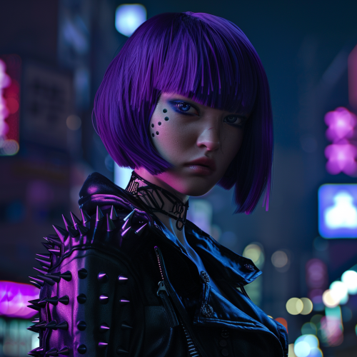 A captivating beautiful character realistic, featuring a female protagonist in a futuristic and cyberpunk aesthetic. With short purplehair and a blunt fringe. She wears a black, studded leather jacket with spikes on the shoulders and sleeves, Mechanical prosthetics are evident, and the color scheme features purple, blue, and black. The character design is a visually striking blend of technology and fashion, perfect for a cinematic setting, fashion, cinematic, neon background --v 6.0 --s 50 --style raw