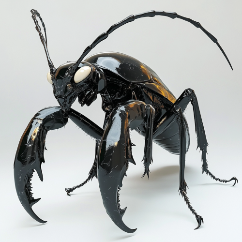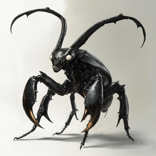 A large insect creature that is a mixture between a praying mantis and a stag beetle. The insect has the body shape and long limbs of a praying mantis, with the distinctive large, curved pincers of a stag beetle. The creature's exoskeleton is entirely black, with a glossy, chitinous texture, and it has stark white, featureless eyes that contrast against its dark body. The legs and body are segmented, and the pincers are menacingly curved and sharp. The insect's stance is aggressive, as if ready to strike.