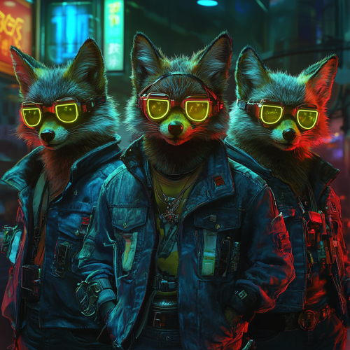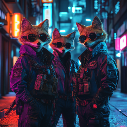 3 tall 9 tailed built adult german techno partying gangsta foxes in dark denim in new blade runner style mixed with SWAT Kat style mixed with top gun aviators. hyper realistic and stoic and neon streets. FULL HD A5 SIZE IMAGE.