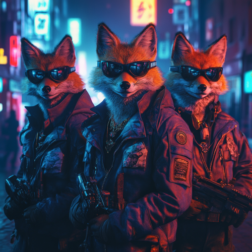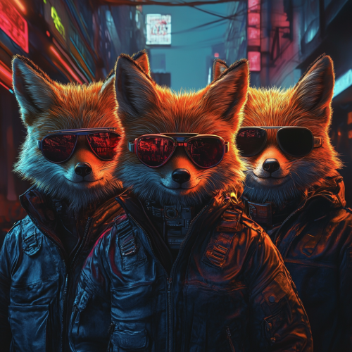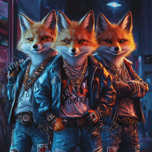 3 adulty techno partying gangsta foxes in denim in new blade runner style mixed with SWAT Kat style. hyper realistic and cheerful and cool. Two outer fixes with neon googles, the middel fox is shorter with neon eyes and bossy.