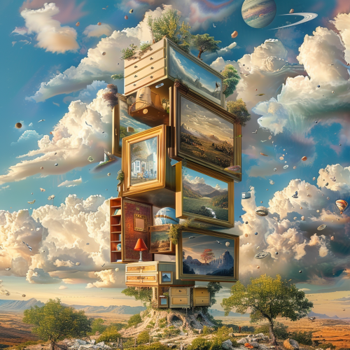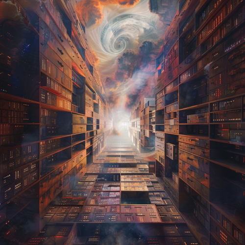 A labyrinth of infinite drawers and shelves inside a massive, floating vault, each compartment filled with swirling clouds of data and abstract symbols, representing the vast and mysterious nature of digital storage and memory. Art Style: Surreal Data Art --v 6.0