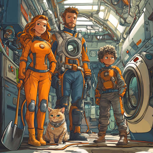 4 differents characters : a tall guy mid 30s that look like napoleon with a rake, gorgeous woman ginger ligth brown straight hair in her early 30s, humanoid kitten, mixed race young boy, with curly gray hair, they are all in cosmonaut suit in a place that look like a factory, a lot of washing machine that can transport you in other dimensions, anime style 4k hd