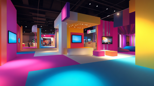 A zone in an entertainment exhibition called: TV ZONE. The zone theme should be characterized by a vibrant color palette, including fuchsia, blue, yellow, purple, and white, to enhance the visual impact and overall atmosphere. --ar 16:9