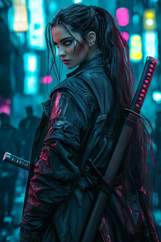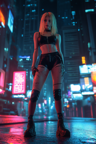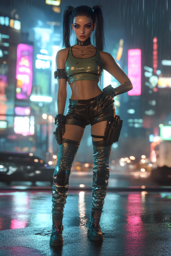 a full body shot of a beautiful female cyberpunk character. She wears tight cyberpunk street wear. In the background is a cyberpunk city at night. Detailed digital painting --ar 2:3 --v 6.1