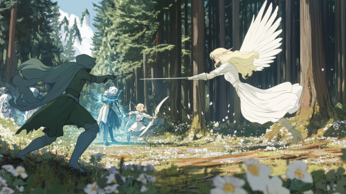 Retrofuturism, Galactic, Wonderland, DnD wizard fighting a Giant troll in the northern forest. Archer souround the creature shooting arrows at it. Flowers on the ground of all colours. --ar 16:9 --c 55 --w 842 --v 6.1 --style raw --s 44