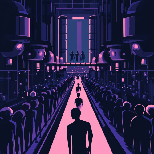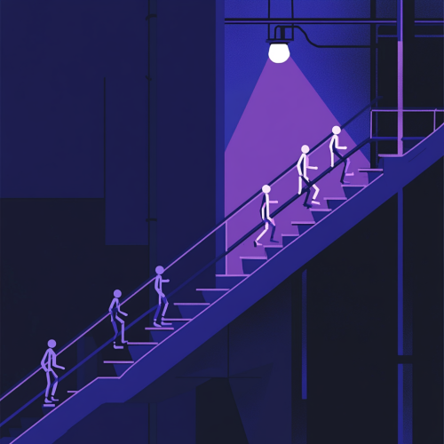flat vector illustration using stick figure pictograms to show humans being cloned at a factory and making their way up a set of stairs and walking towards a light, the color palette should be dark shades of blue and purple, keep it simple and clean