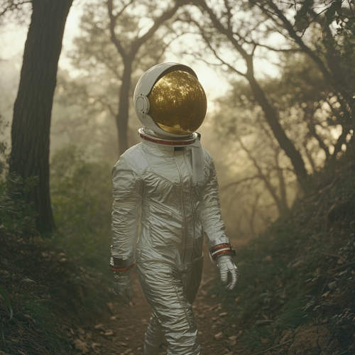 Visualize a female astronaut, helmet on and silver suit walking through a dense oak forest, a path winding towards the forest covered with hills. The sun is rising and there is fog on the surface. long exposure, large iris aperture, chiaroscuro, Rembrandt type lighting