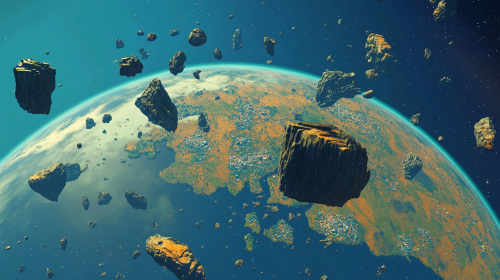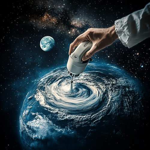 Surreal image of a giant hand using a modern electric hand mixer to stir the Earth’s ocean from space, Earth forming a whirlpool as if it’s a mixing bowl, the Moon floating nearby in a dark cosmic background, realistic textures, high-resolution, dramatic lighting, sci-fi and surrealism, futuristic and clean design