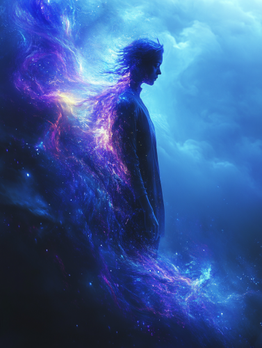 A glowing phoenix rising from within a human silhouette, symbolizing regeneration and vitality, delicate particle effects flowing outward, colors in shades of blue, purple, and silver, clean and futuristic look --v 6.1 --stylize 1000 --ar 3:4
