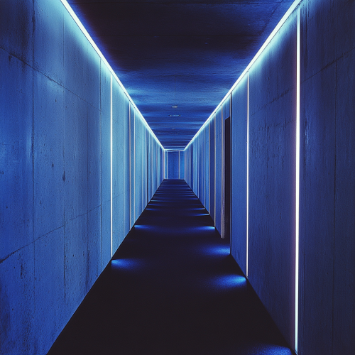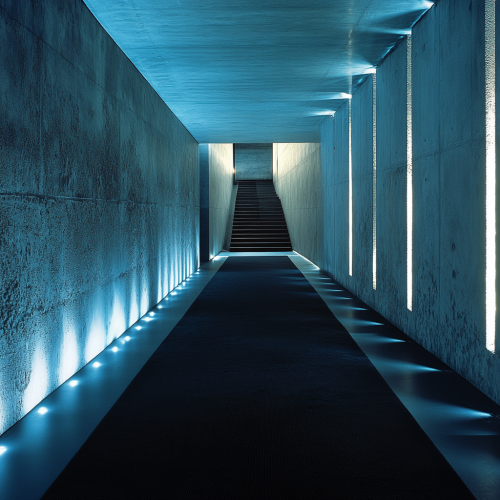a long, dark corridor with no doors, leading to a staircase at the end. The walls and floor are made of rough gray concrete, while the ceiling features a reflective metal finish that enhances the lighting. On either side of the corridor, vertical light strips are installed, transitioning from cool blue light at the front to warm light deeper in the space. A black carpet runs along the floor, adding an elegant touch to the scene. The overall atmosphere conveys a sense of tension and anticipation