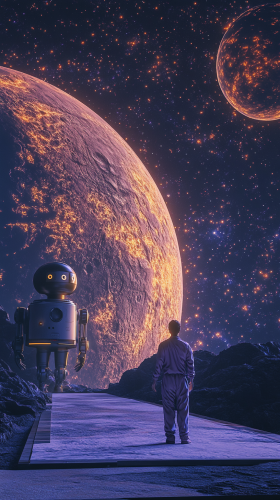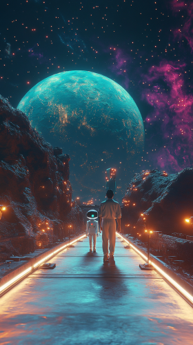 a phone wallpaper with a deep space background inspired from The Hitchhiker's Guide To The Galaxy, there is a large planet in the background, on foreground is a man in pajamas with his thumb out to hitchhiker, along side the man is Marvin the android robot, they both are standing on a ramp leading into the space, they are both looking up into the stars, 3D render --ar 9:16