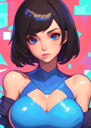 Torso Up Portrait of an Attractive Cute Japanese Woman Character with Short Black Hair and Blue Eyes Dressed as a Sci-fi Retro-Futurism Space Hero, Japanese Animation Cartoon Art Style, Same Face as 765430206, --ar 5:7 --niji 6