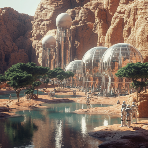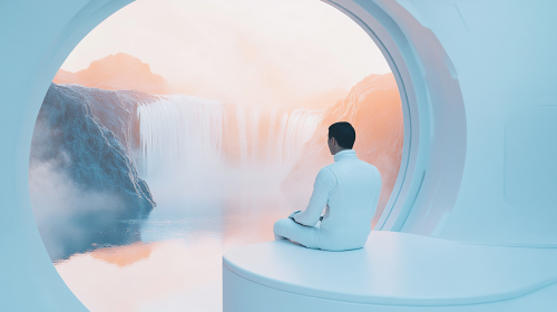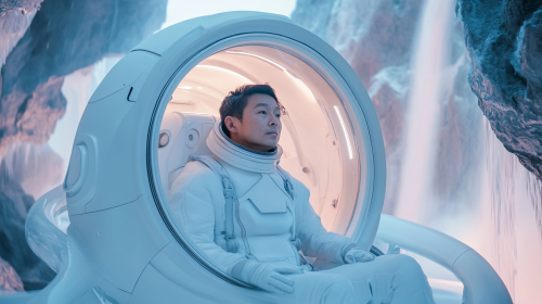 high resolution photography the interior of a white minimal futuristic spaceship with an asian man far away in his 40s wearing a white neopren space suit looking through a window. Background is a set of light blue waterfalls and peach color mountains with death valley shapes. Fog environment and minimalistic aesthetic