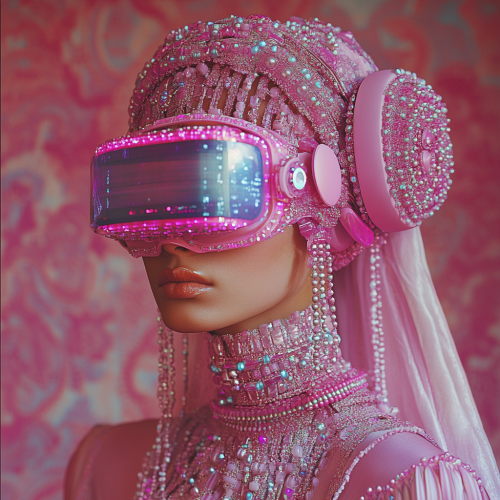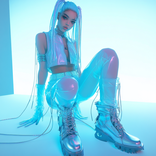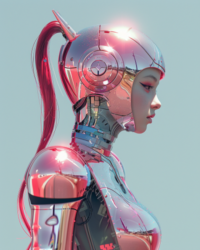an illustration inspired by the 80s Japanese style of hajime sorayama of a feminine robot, except its whole body is mirror pieces like a disco ball with bright magenta light bouncing off and sparkles. It also has parts that look like pony tails on both sides of her head like sailor moon. On a plain light blue background. --ar 4:5 --s 666 --v 6.0