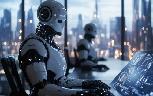 Show a futuristic cityscape with advanced robotics, AI, and humans collaborating in sleek, high-tech environments. Blend industrial elements with modern digital interfaces, creating a sense of both power and innovation. Use dramatic lighting to highlight the transition into this new age, with a horizon that hints at boundless possibilities for the future of labor and technology, --ar 8:5