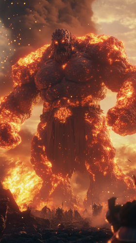 a colossal fire giant standing over a battlefield, epic, fight, battle, warriors, 8k, vivid, 8k ultra detailed, 8k ultra realistic, 8k cinematic, 8k hyper detailed, 8k hyper realistic, 8k photo realistic, 8k insanely detailed, 8k insanely realistic, intricate, high definition, --ar 9:16 --v 6.1