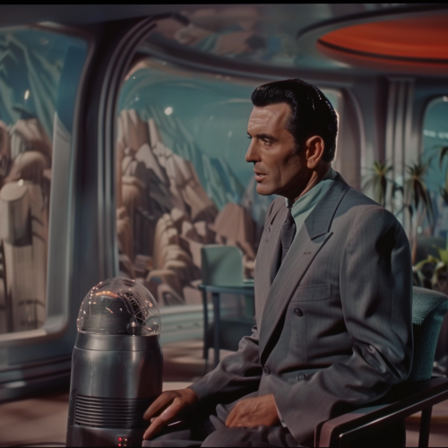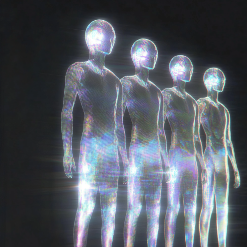 5 holographic humanoid robot auras. Pixelated computer screen. Stanley Kubrick, occult mysticism robotics. --ar 1:1 --style raw --v 6.1 --sref 1456780722 19476775 670872753