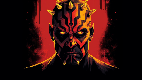 A highly detailed, centered portrait of Darth Maul from Star Wars: The Clone Wars, wearing a deep, dark Sith hood that partially conceals his red and black tattooed face. His intense yellow eyes are perfectly centered, glaring straight into the camera with a deadly, unwavering stare. His features are unmistakably animated in The Clone Wars style, with intricate, stylized markings and bold outlines capturing his fierce appearance. The background is filled with swirling flames, casting an eerie glow that highlights his sharp, angular features under the hood. The firelight enhances the menacing shadows on his face, enhancing the sinister, intimidating aura of a Sith Lord. --v 5.1 --s 1000 --ar 16:9