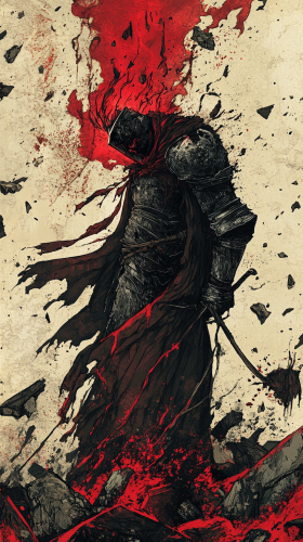 a knight wearing battle worn black armor and a tattered tabard on a war torn medieval battleground, body writhing in agony with a strange aura emitting from him, done in a comic style with use of red colors --ar 9:16 --v 6.1