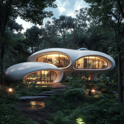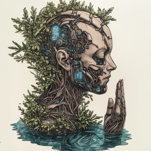 a neotraditional tattoo design of a meditating cyborg head with praying hands surrounded by intricate greenery and water. The head is seen from an angle. The design should depict a peaceful synergy between humanity, technology and nature.