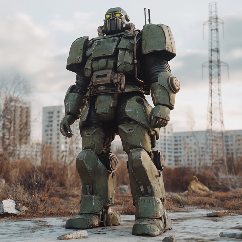 3m tall Russian military soldier with retro sci-fi power armor with ww2 aesthetics, he is strong and armor is super bulky yet plates allow for mobility, unreal, ultra realistic, 4k, octane render --s 50