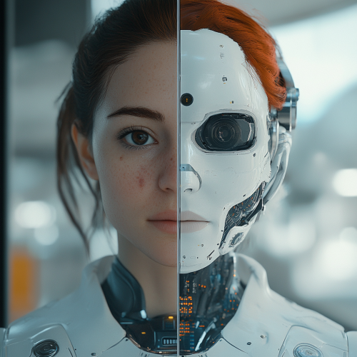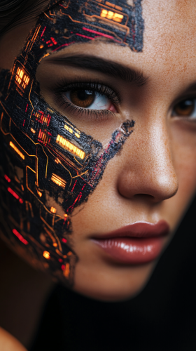 Hyper-realistic close-up portrait of a young woman with deep brown eyes and smooth skin, intricate abstract face paint inspired by futuristic cybernetic designs. Bold black lines with vibrant splashes of red, gold, and yellow across her face, resembling digital circuitry or tech patterns, illuminated accents reflecting light, creating a high-tech, sci-fi aesthetic. Emphasize dramatic lighting, soft shadows, and the detailed texture of the face paint. Cinematic focus on her intense gaze, soft lips, and flawless skin. Dark, blurred background to bring attention to her striking features. Hyper-detailed, digital art, ultra-realistic, cinematic, 8K. --ar 9:16 --style raw --v 6.1