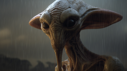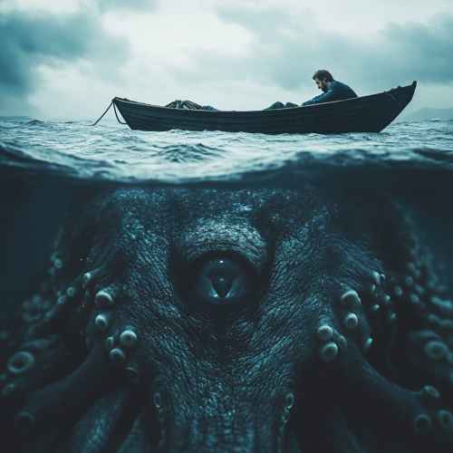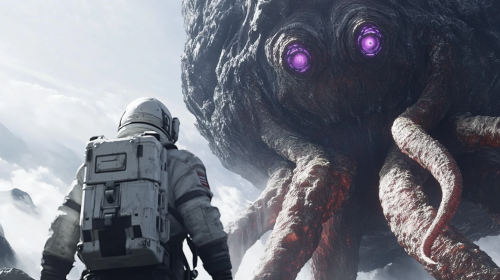 An astronaut outside his spacecraft, suspended in space. He looks in awe as a colossal tentacled creature with purple eyes is a few kilometers away from him. The photographic quality is realistic. --ar 16:9 --v 6.1 --style raw