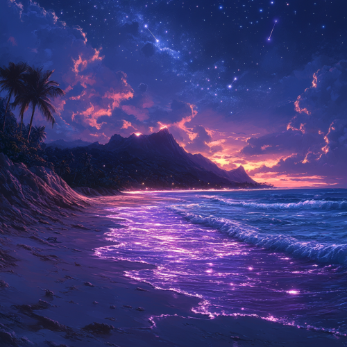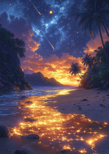 A beach by the sea, a starry sky at night, distant mountains and coconut trees, glowing yellow water flowing down from behind the beach into the distance, meteors streaking across the dark night sky, in the style of anime, high definition, super detailed, ultra-high resolution, bright colors, clear picture quality --ar 5:7 --s 750 --v 6.1