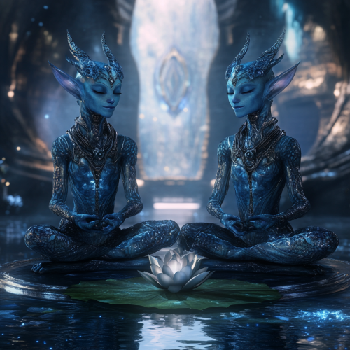 two tall blue elven aliens with blue skin and elf ears skinny bodies sitting across from each other on a lotus leaf in a magical room of manifestation on a spaceship. They are in tantric communion