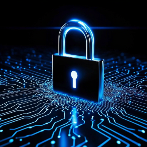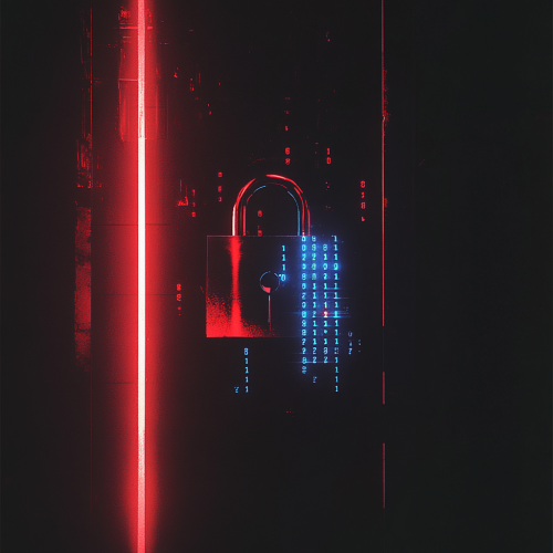 image in 3:2, black background, soft red light on the left side, padlock is on the right, blue light on the right side, padlock is illuminated by both lights but the strongest is blue, on the left there are several lines of red 1s and 0s, the 1s and 0s enter the padlock and become blue,