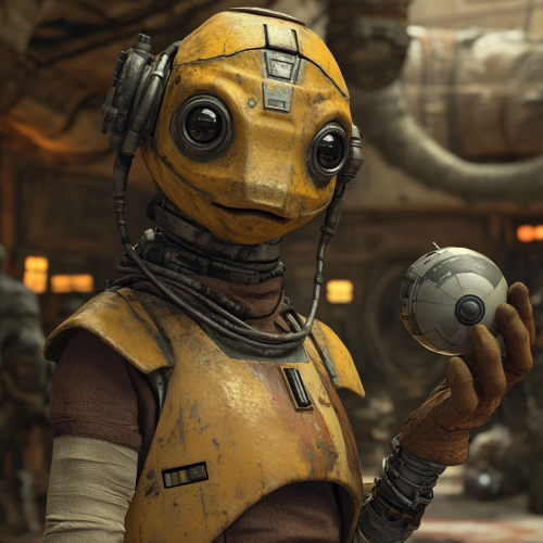 Boushh, from Star Wars, standing in Jabba's palace, holding out a hand with a thermal detonator in it. Boushh has a helmet on, that has a visor, and a snout ending in a dark rubbery socket. The rest of the helmet is yellowish. On the side of the visor are tubes going back around the helmet, with the fronts parallel to Boushh's line of sight, and ending in some tech nodule. The thermal detonator is a spherical grey and yellowish ball with some tech buttons and lights on it. Boushh looks threatening.
